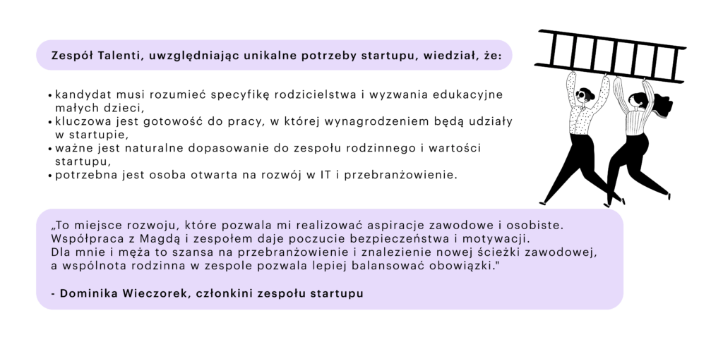 Talenti, dzięki wieloletniemu doświadczeniu siostrzanej Fundacji Mamo Pracuj i współpracy z różnorodnymi podmiotami, rozumie, że w startupach liczy się coś więcej niż CV. To połączenie kompetencji, wartości i autentycznego zaangażowania w misję. Co ważne, Talenti dysponuje własną bazą kandydatek – w tym osób z pasją do tematyki związanej z wychowywaniem dzieci i zajmujących się programowaniem. To ogromna przewaga nad tradycyjnym poszukiwaniem pracownika, co minimalizuje ryzyko kolejnej pomyłki. Co ważne – talenti jest startupem społecznego wpływu i doskonale rozumie takie wyzwania