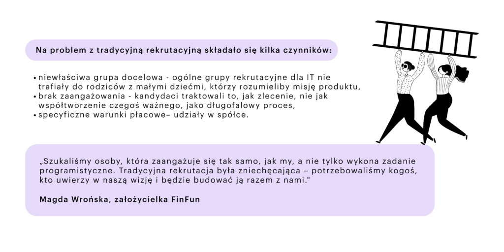 FinFun to startup założony przez Magdę i jej męża. Na pokładzie nie potrzebowali dużego zespołu, a właśnie pojedynczych osób, które będą zaangażowane w budowę aplikacji równie mocno, jak oni. Magda próbowała standardowych ścieżek rekrutacji – szczególnie postów w grupach na Facebooku skupiających się na branży IT. Efekt? Zgłaszali się głównie studenci bez wystarczającego zaangażowania lub osoby szukające standardowej pracy zarobkowej.